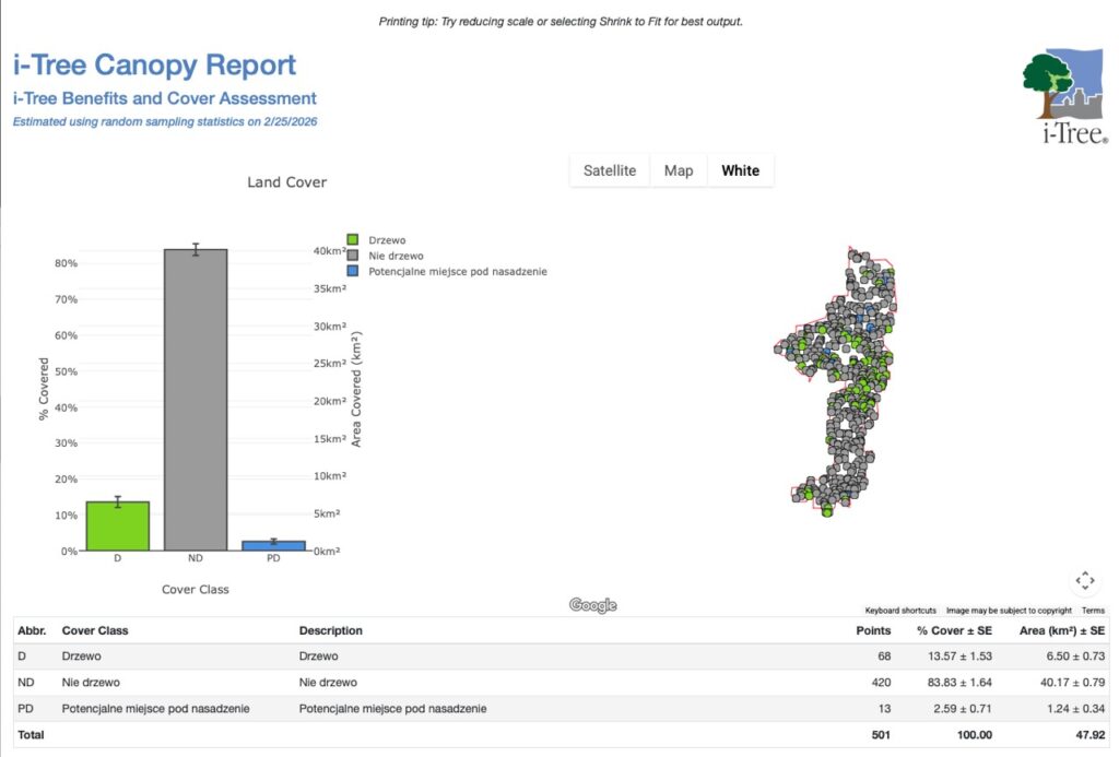 - Wyznaczenia konkretnych stref do priorytetowych nasadzeń (na podstawie wytypowanych „miejsc o potencjalnej możliwości posadzenia drzew”).